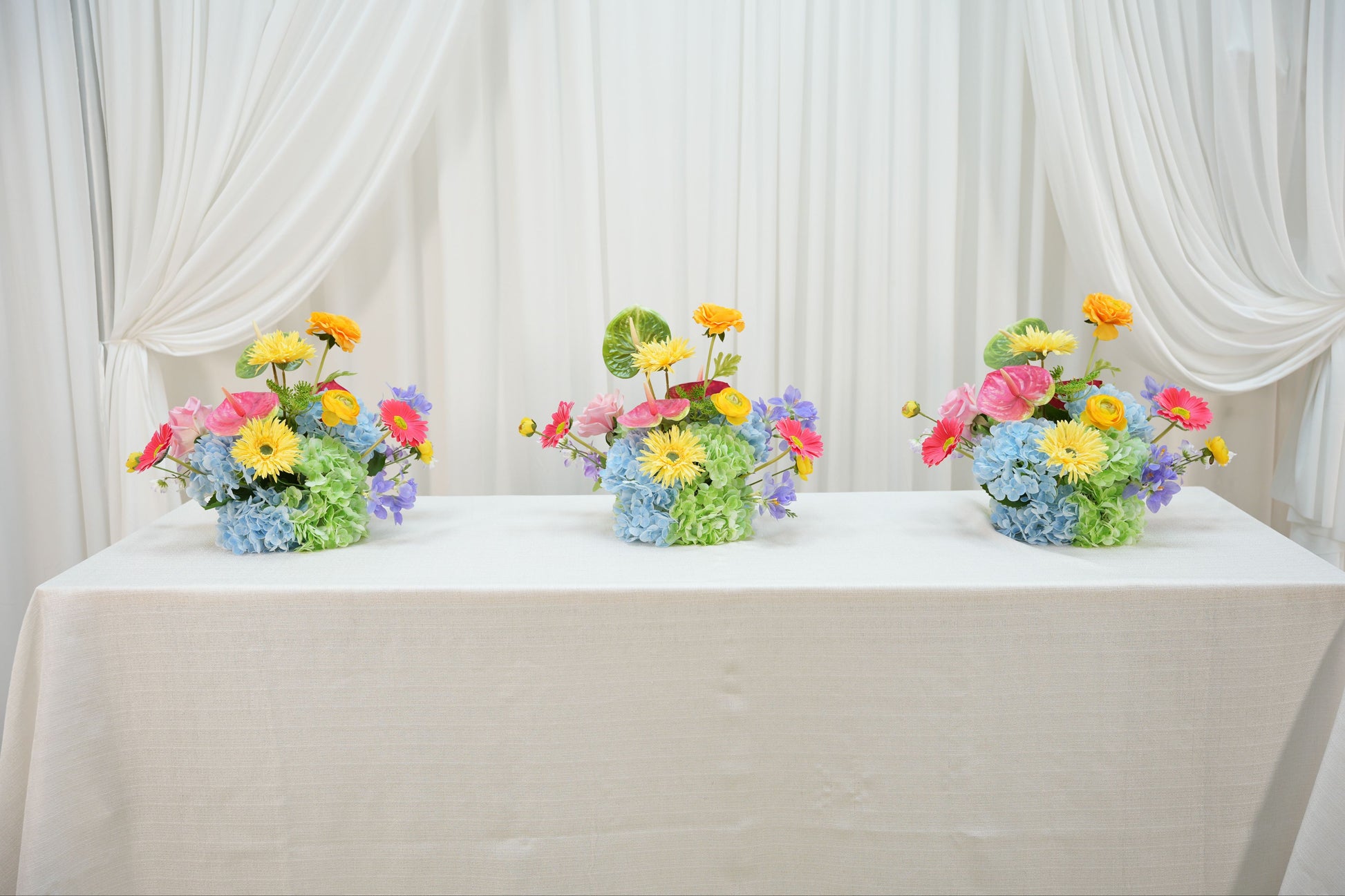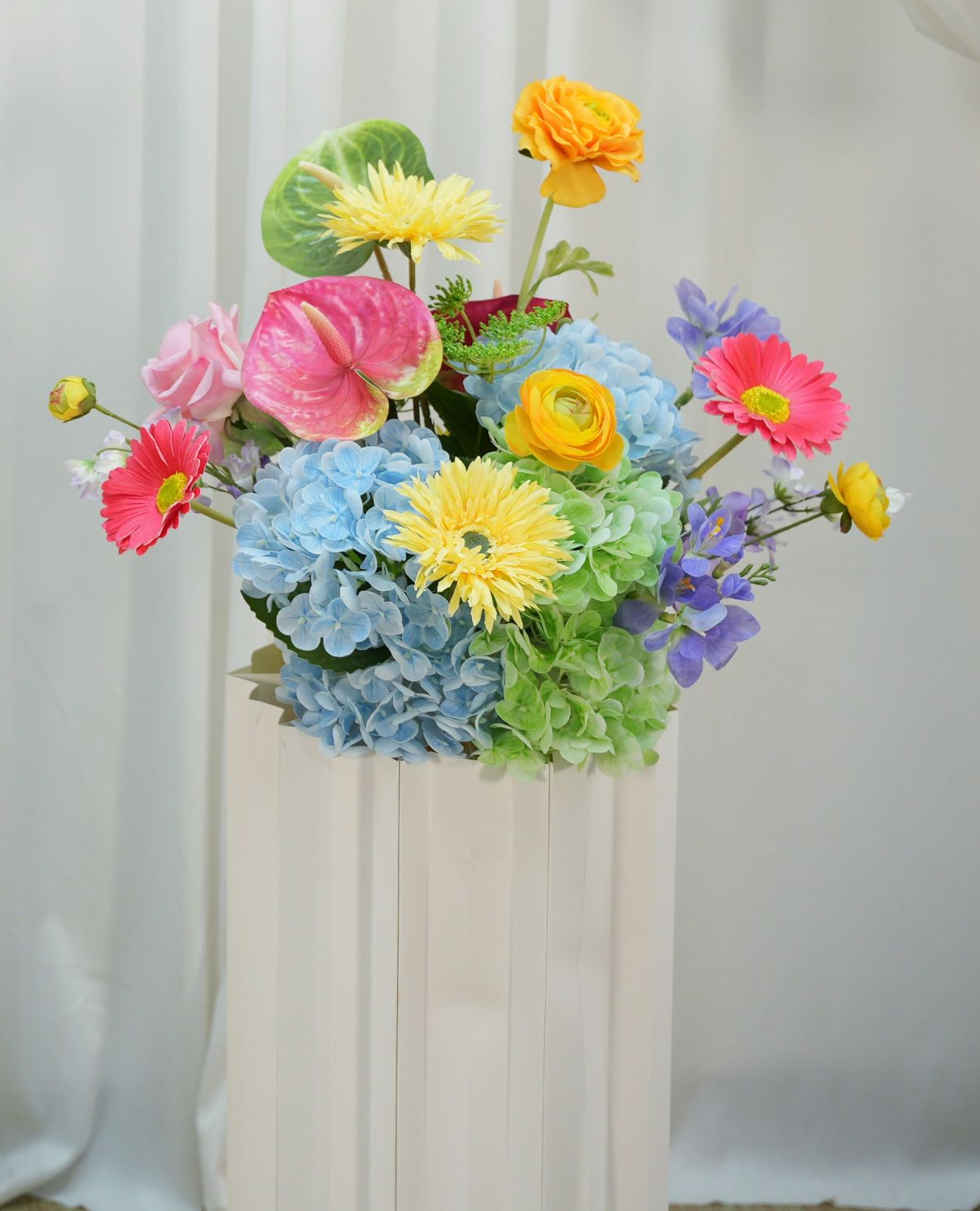 Med hortensia i blød blå og frisk grøn, statement-anthurium, farverige gerbera, ranunkler, roser og legende lilla toner giver dekorationen et luksuriøst, men stadig legende udtryk.
