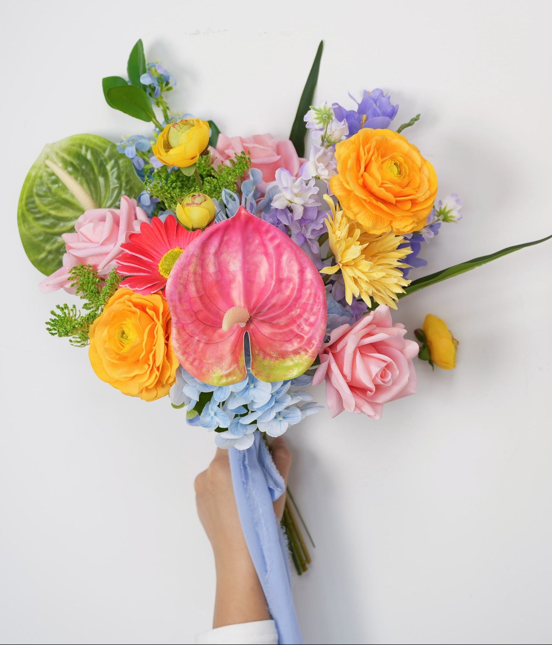 Brudebuketten fra BOLD LOVE-kollektionen er skabt til bruden, der ønsker at gøre et farverigt statement. En livlig blanding af luksuriøse blomster som anthurium, ranunkler, roser, hortensia, gerbera og bløde lilla accenter skaber et moderne og udtryksfuldt udtryk, der emmer af personlighed og glæde.